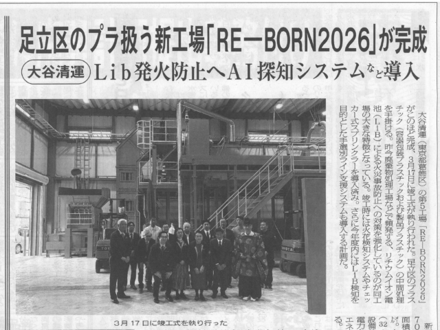 このたび、環境分野の専門紙「環境新聞」(令和8年4月8日・第2796号)において、当社の新工場「RE-BORN2026」およびリチウムイオン電池対策に関する取り組みが掲載されました。